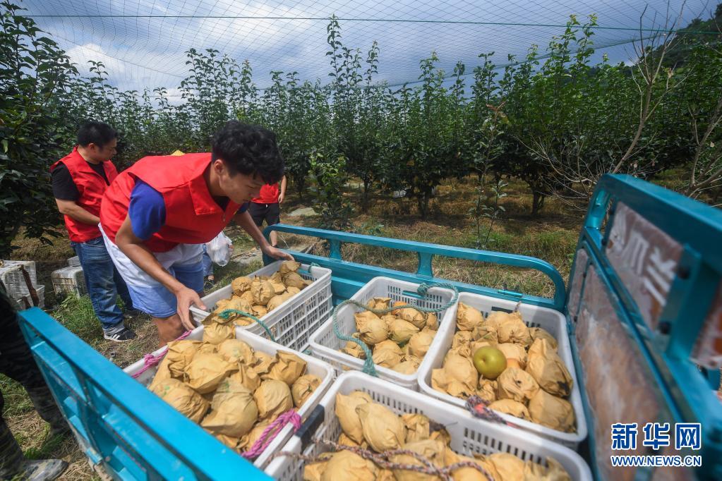 当日,浙江省湖州市吴兴区东林镇组织党员志愿者在东林镇三合村的百亩梨园内帮助种植户们采摘、分拣和搬运翠冠梨,趁着台风过后天气转晴,抢抓梨子采摘、打包和售卖的进度。