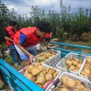 7月29日,党员志愿者在帮助种植户搬运翠冠梨。