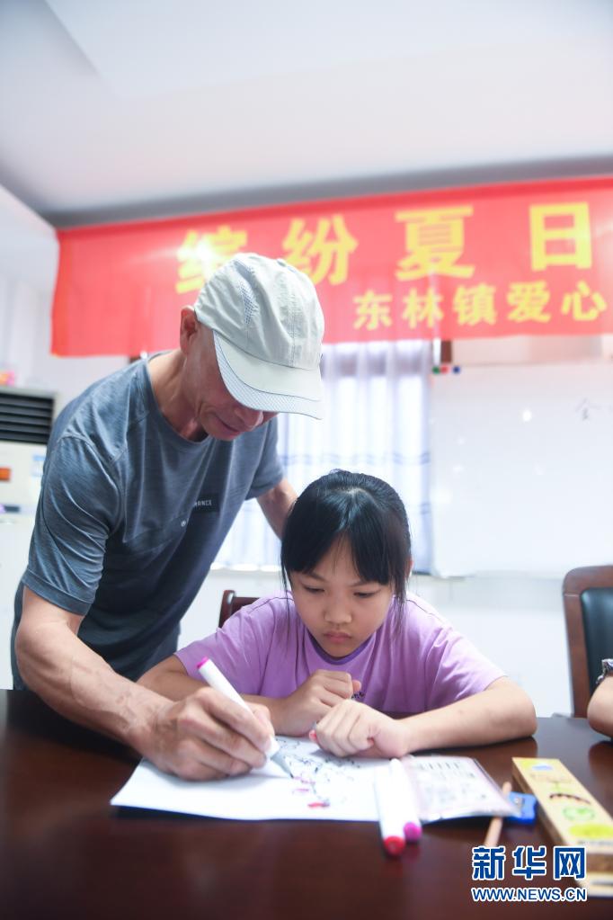 7月29日,在位于东林镇的浙江金甲饲料有限公司内,员工子女在志愿者老师的带领下参加绘画兴趣活动。新华社记者 徐昱 摄