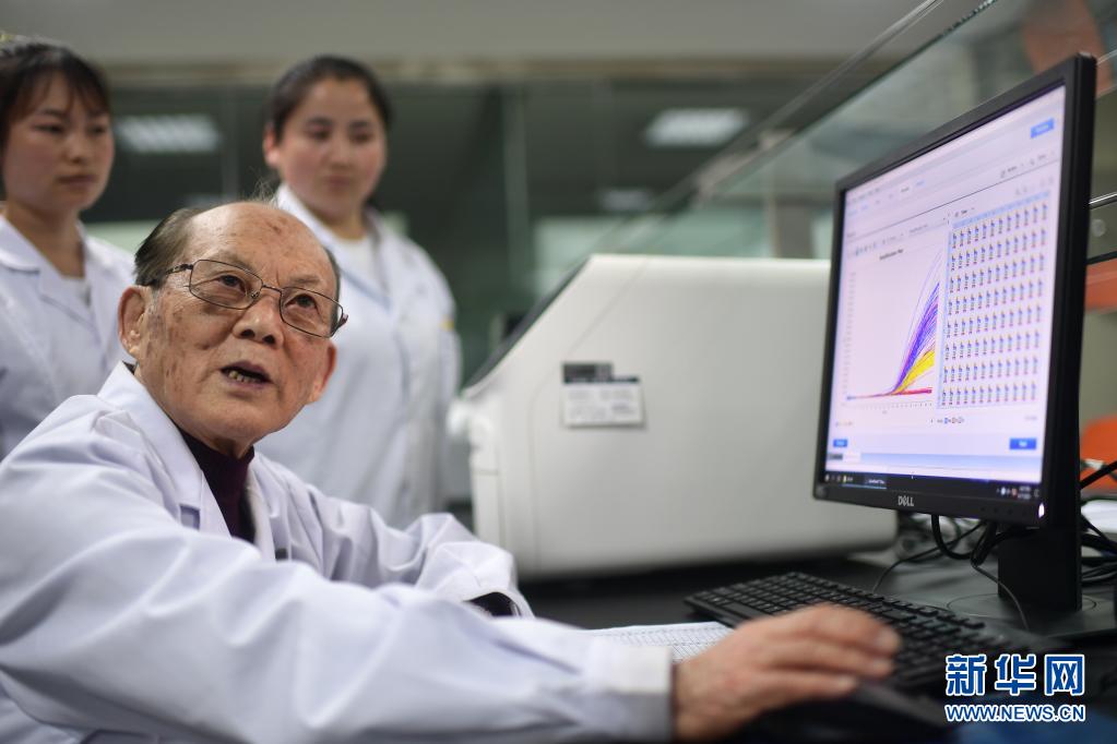 吴天一(前)在青海西宁的实验室内和学生讨论(6月17日摄)。