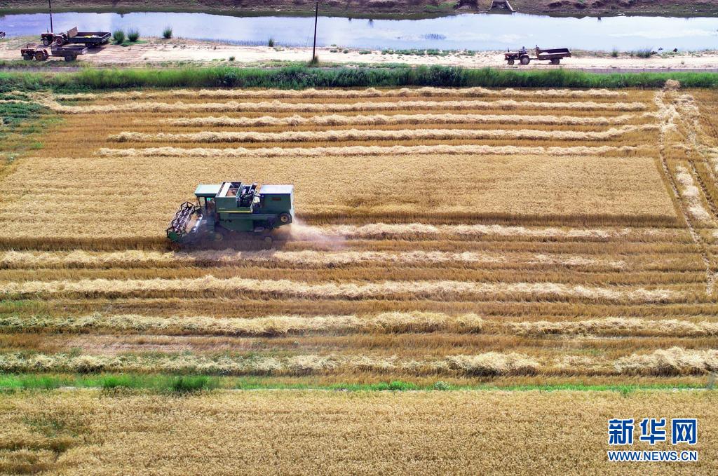 7月29日,在内蒙古巴彦淖尔市临河区小麦种植基地,收割机正收获小麦(无人机照片)。