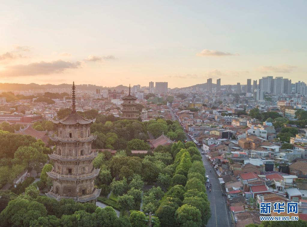 这是朝霞中的泉州开元寺东西塔及周边古城保护核心区域(7月8日摄,无人机照片)。