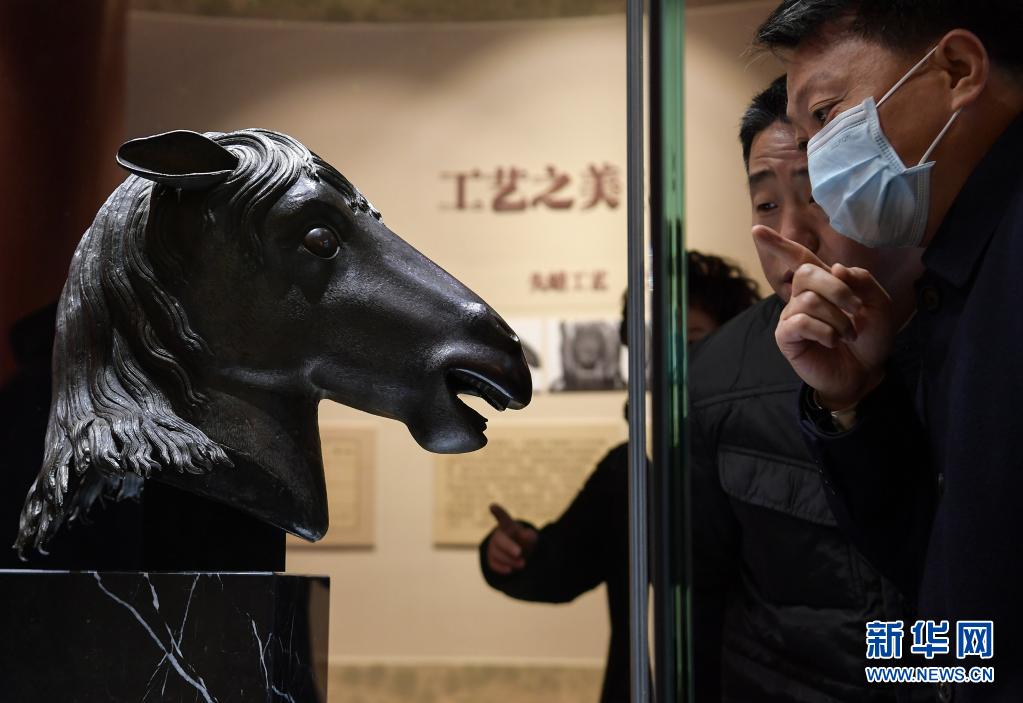 参观者在北京圆明园展厅内观看马首铜像(2020年12月1日摄)。