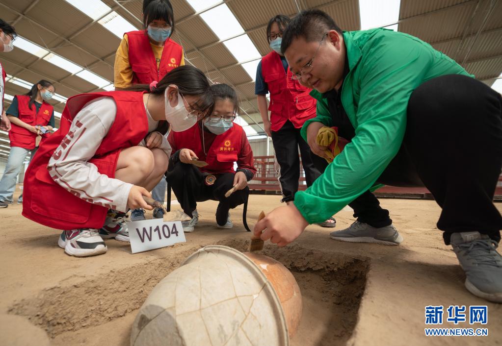 在河北沧州黄骅市郛堤城遗址瓮棺葬群发掘现场,黄骅市博物馆工作人员向沧州交通学院学生讲解考古发掘知识(6月11日摄)。