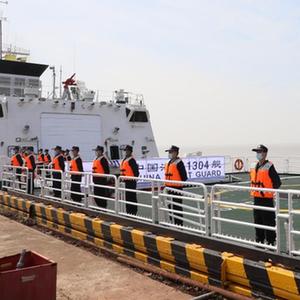 中国海警局“衢山舰”缓缓驶离上海船厂码头(7月30日摄)。