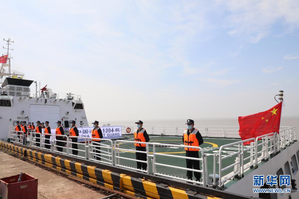 中国海警局“衢山舰”执法员在飞行甲板上整齐列队(7月30日摄)。