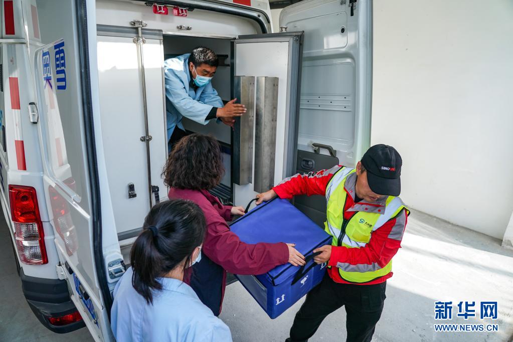 7月22日,刘思(右一)和四川甘孜州疾控中心工作人员交接疫苗。