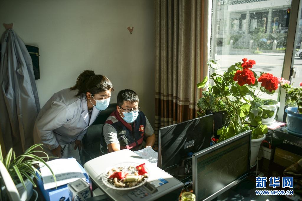 7月23日,四川甘孜州疾控中心工作人员黄亮(右)在稻城县疾控中心与当地工作人员对接疫苗信息。
