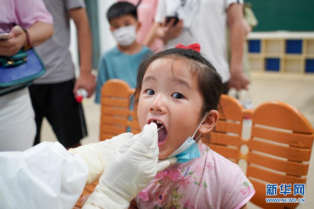 在南京市江宁区龙西社区核酸检测点,一名小朋友在接受核酸检测取样(7月24日摄)。新华社记者 李博 摄