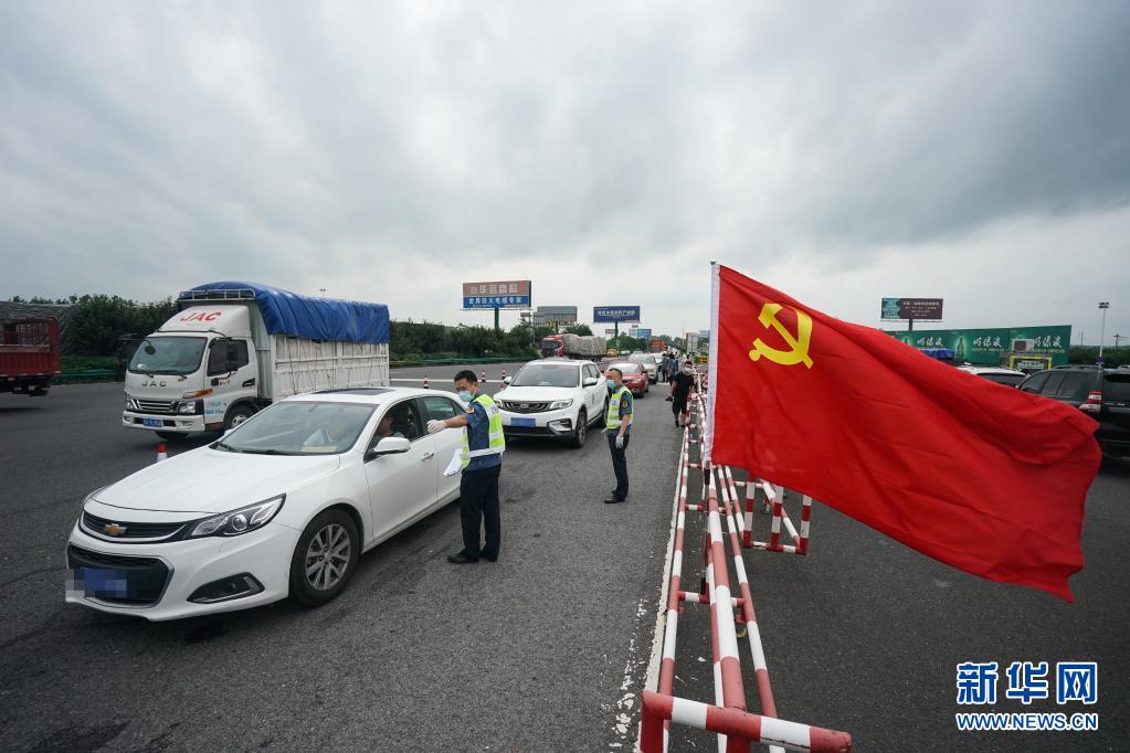 7月25日,在宁洛高速公路曹庄收费站,执法人员对不符合离城条件的车辆驾乘人员进行劝返。新华社记者 季春鹏 摄