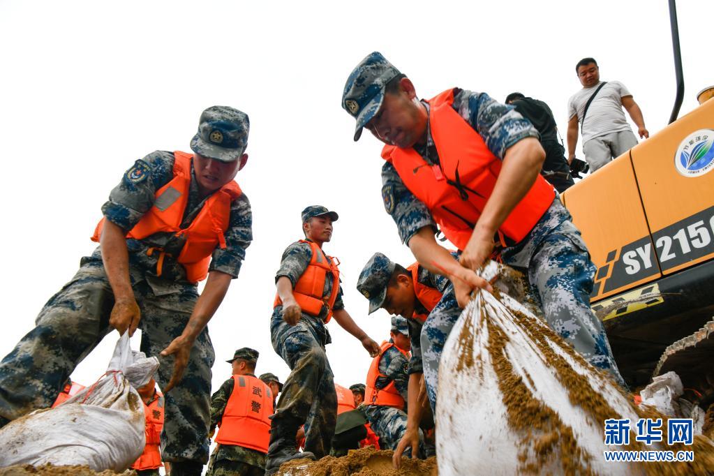 空军某汽车运输团官兵在加固长葛市南席镇马武村双洎河沿岸堤坝(7月23日摄)。新华社发(高玉豹 摄)