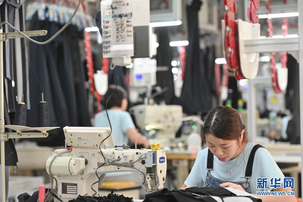 在位于福建省泉州市经济技术开发区的九牧王西裤智能化生产车间,工人在自动化西裤吊挂流水线上作业(7月30日摄)。