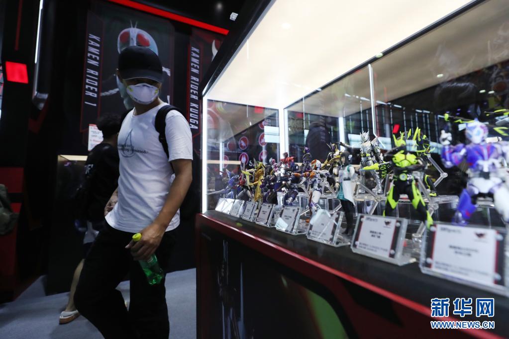 7月31日,一名参观者从一组假面骑士人物手办展柜旁走过。