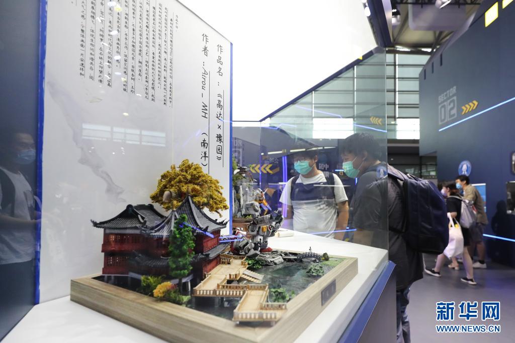 7月31日,一组高达机器人模型结合中国传统建筑的展品吸引参观者驻足观看。