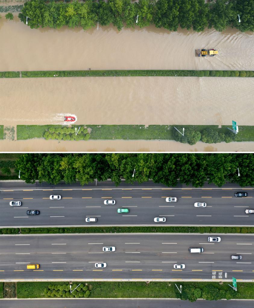 这是一张拼版照片:上图为7月22日,在郑州市中牟县阜外华中心血管病医院附近,救援人员利用舟艇转移人员(新华社记者才扬摄,无人机照片);下图为7月26日,在郑州市中牟县阜外华中心血管病医院附近同样的位置,社会车辆已经正常通行(新华社记者李安摄,无人机照片)。