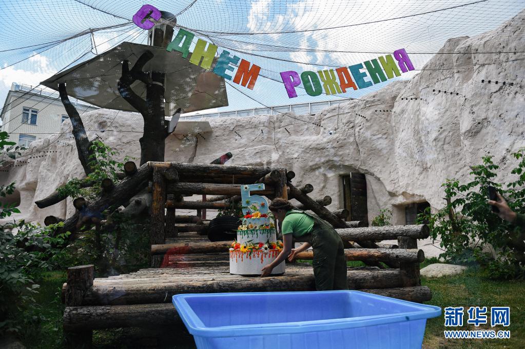 7月31日,在俄罗斯莫斯科动物园,工作人员搬运为大熊猫“如意”准备的“生日蛋糕”。