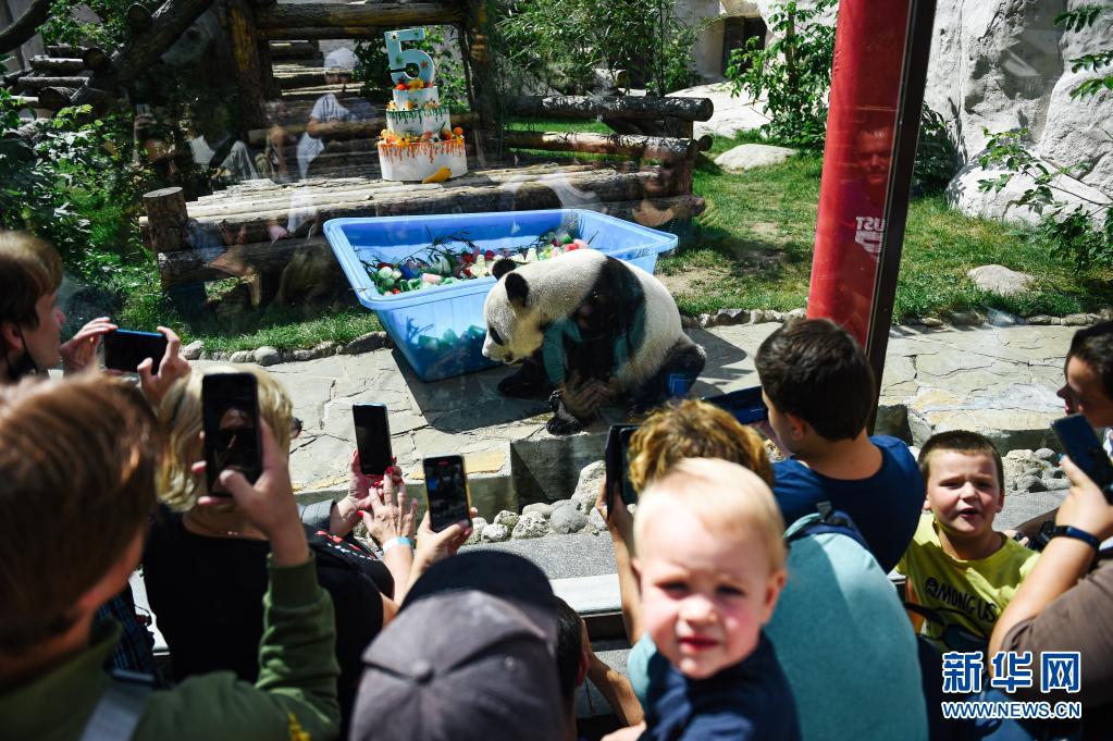 7月31日,在俄罗斯莫斯科动物园,人们和大熊猫“如意”一起庆祝生日。