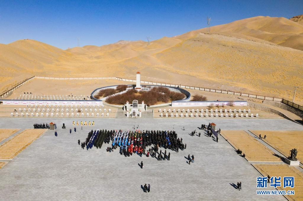 清明时节,西藏阿里的党员干部、解放军、学生及群众,聚集狮泉河烈士陵园,祭奠英灵(2021年4月4日摄,无人机照片)。