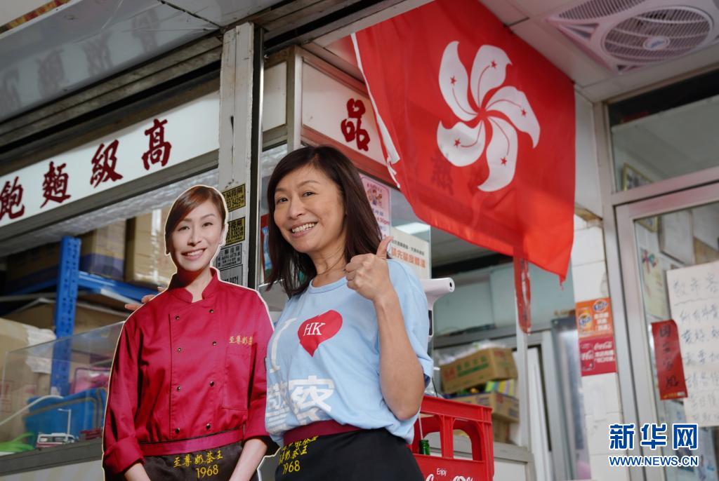 在香港鲤鱼门“银龙咖啡茶座”餐厅,女老板李凯瑚在店门口接受记者拍照(7月26日摄)。