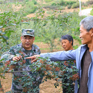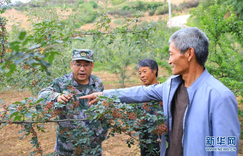 张洪峰(左)深入田间地头了解花椒价格,和群众一起探讨花椒培育技术(2020年7月10日摄)。新华社发(张仲海 摄)