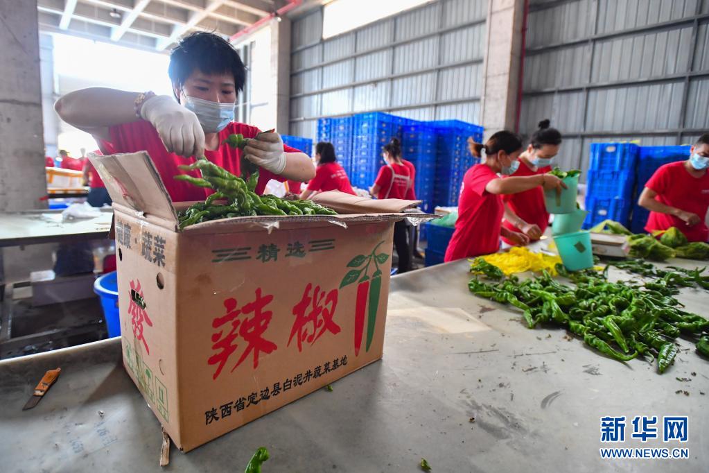 8月1日,在位于长沙市望城区的湖南高星物流园,蔬菜仓库的工作人员分拣辣椒。