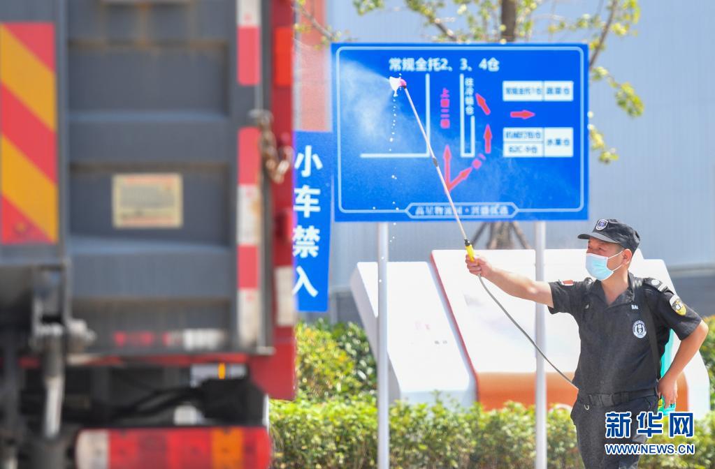 8月1日,在位于长沙市望城区的湖南高星物流园门口,工作人员对进入园区的货车消毒。