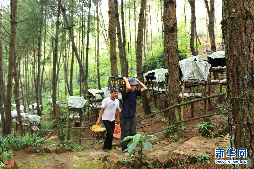 当地群众在贵州省六盘水市六枝特区月亮河乡的花德河国有林场内收获菌类(2021年7月24日摄)。