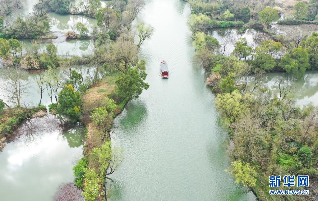 浙江杭州西溪湿地水道(2021年3月2日摄,无人机照片)。