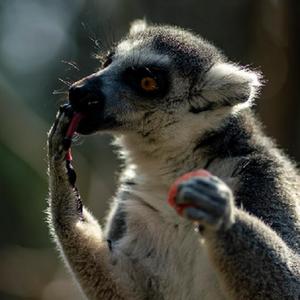 8月2日,云南野生动物园的狐猴在享用“西瓜冰棒”。