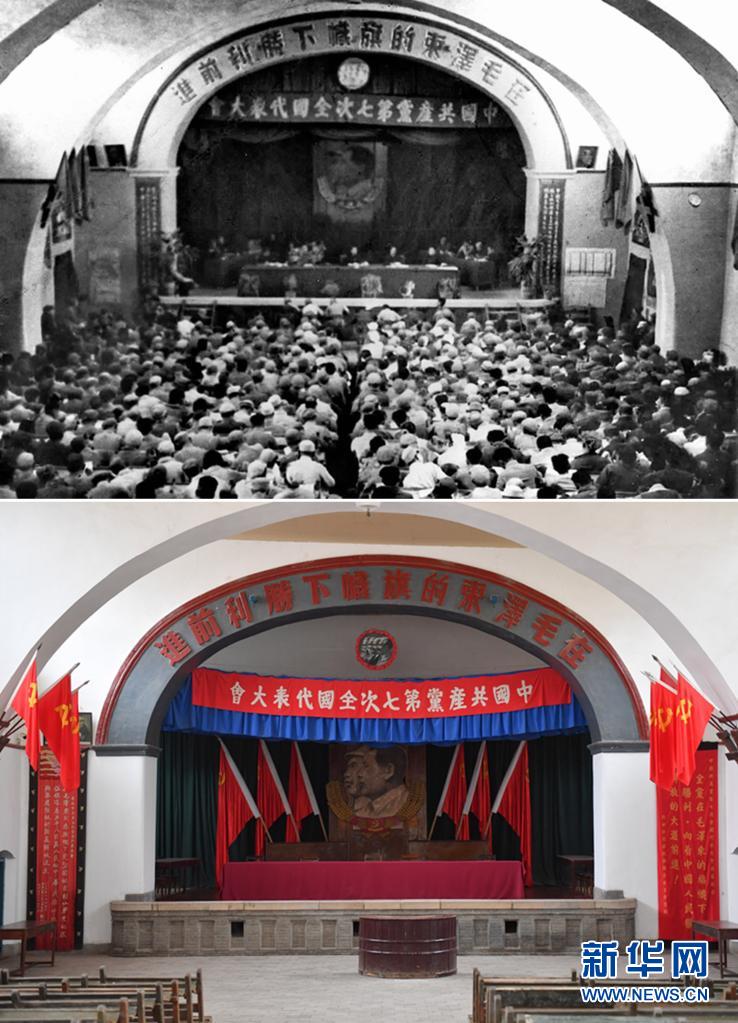 拼版照片:上图是中共七大会场(资料照片),下图是2021年3月31日拍摄的位于延安市杨家岭革命旧址的中共七大会场(新华社记者 张博文 摄)。