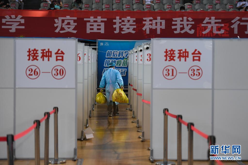 8月2日,在南京市鼓楼区五台山体育中心新冠病毒疫苗集中接种点,工作人员结束一天工作后运送医疗废弃物,准备消杀。