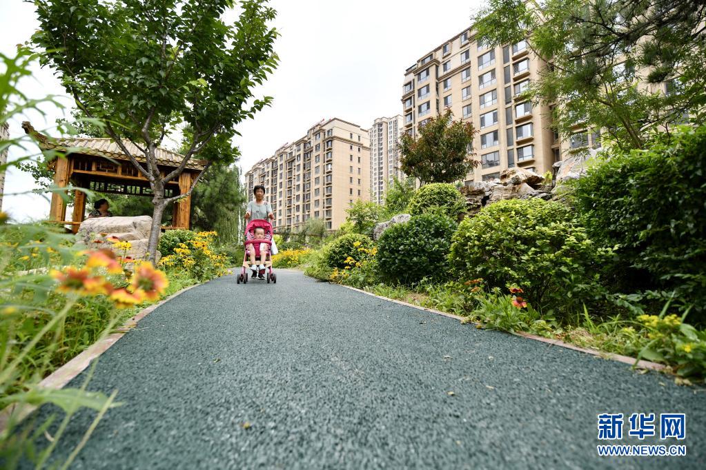 8月1日,迁安市君和领秀湾小区居民在小区内的透水路面上行走。