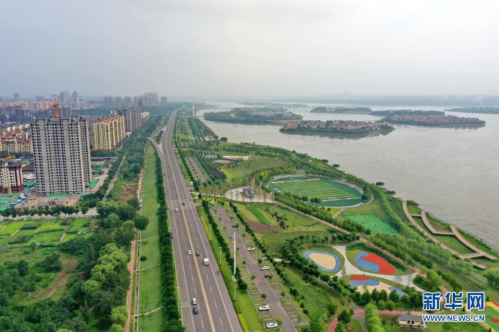 这是迁安市黄台湖水利风景区沿岸“海绵化”改造后的滨湖植被缓冲带(7月31日摄,无人机照片)。