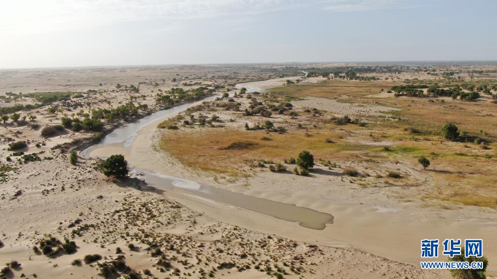 生态水流经干涸的塔里木河下游河道(8月2日摄,无人机照片)。