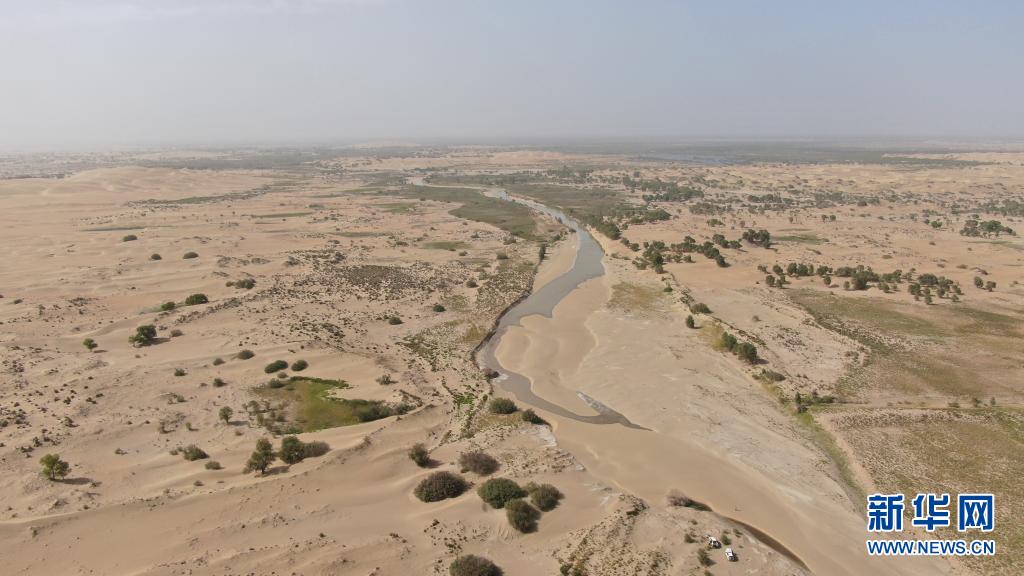 生态水流经干涸的塔里木河下游河道(8月2日摄,无人机照片)。