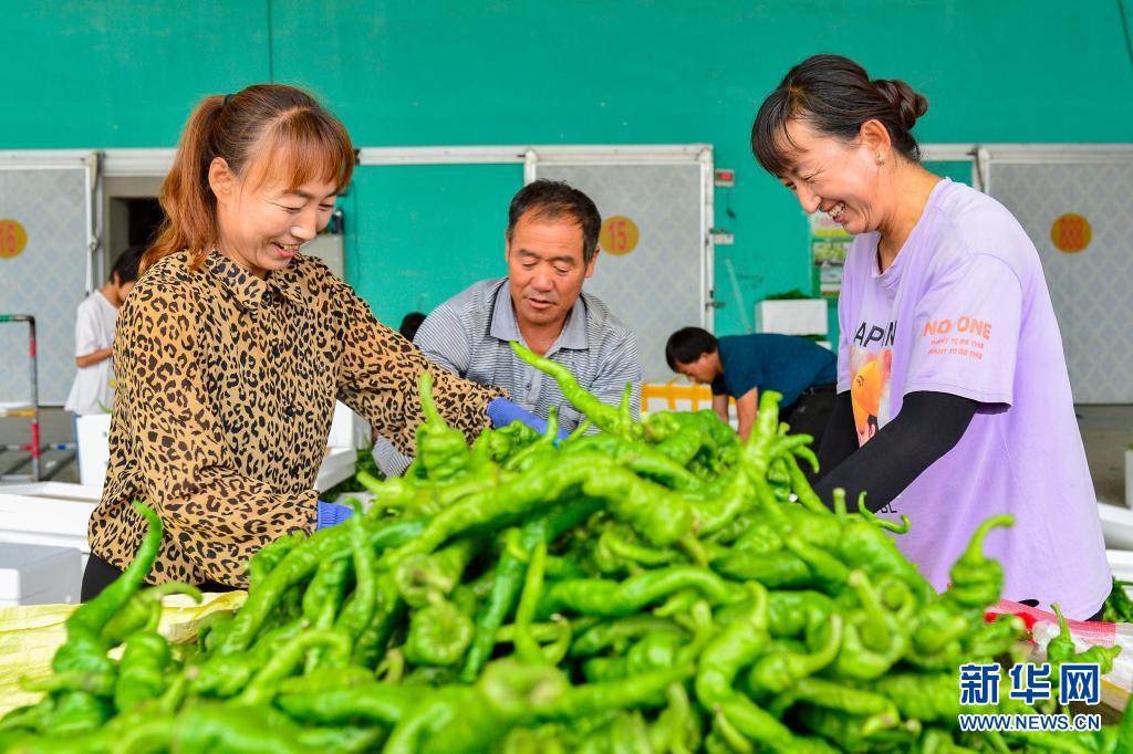 8月3日,农民在鄂尔多斯市鄂托克前旗城川镇一家合作社里分拣鲜辣椒。