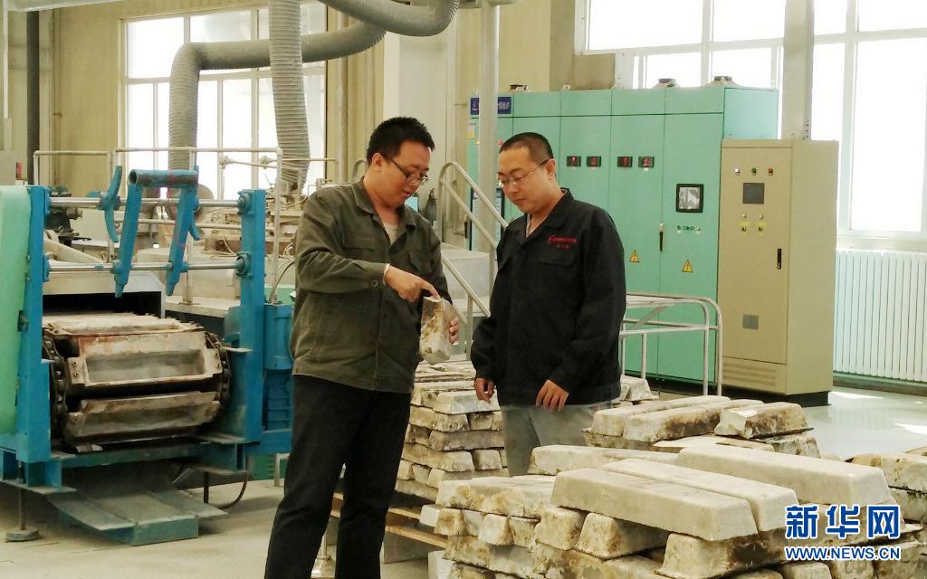 在内蒙古包头稀土研究院,科研人员胡文鑫(左)和同事分析合金断面(资料照片)。