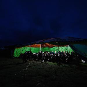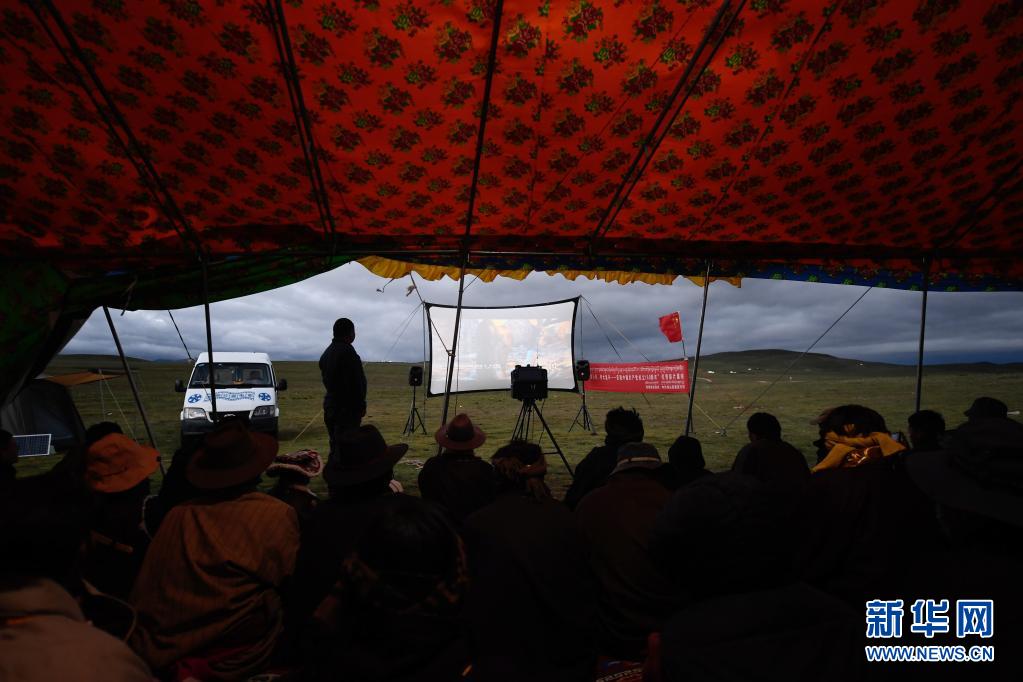 8月3日,在玛沁县当洛乡贡龙村的夏季草场上,牧民群众在看电影。