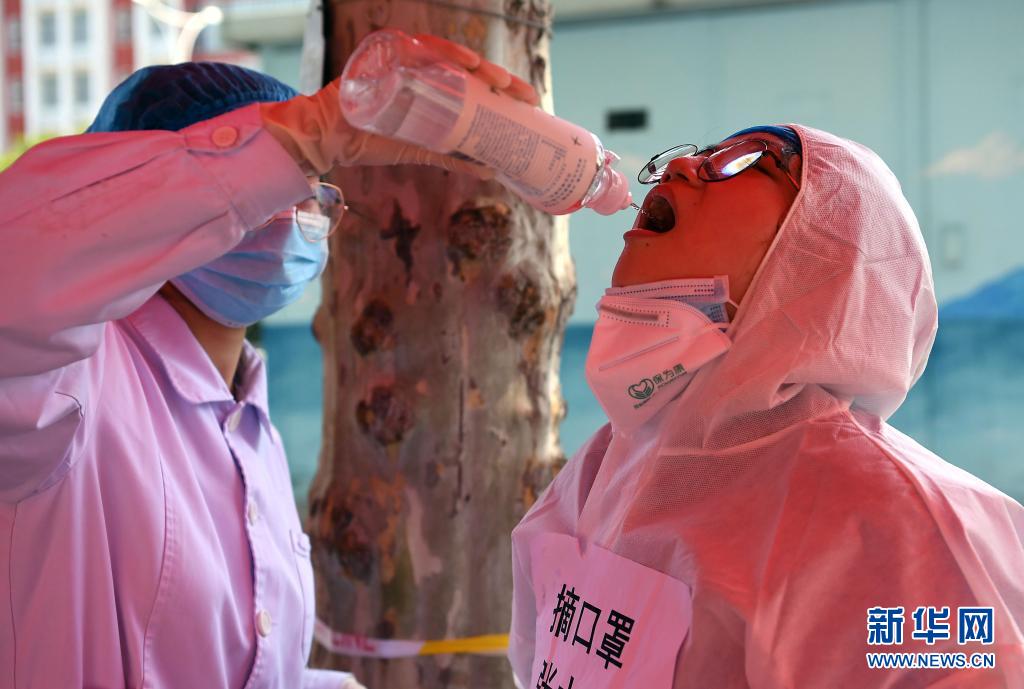 8月2日,在郑州市郑东新区一个核酸检测点,同事在检测取样间隙喂医务人员方欣雨喝水。新华社记者李安摄