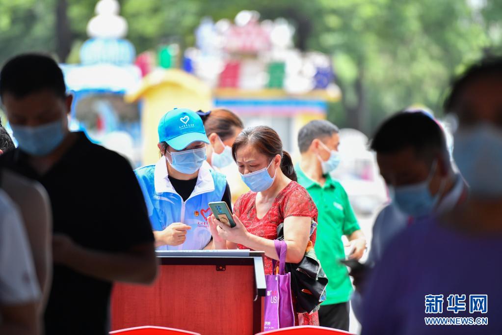 在长沙市天心区赤岭路街道白沙花园社区核酸检测点,志愿者引导居民扫码登记身份信息(7月31日摄)。7月31日,湖南省长沙市天心区赤岭路街道乾城嘉园的疫情风险等级调整为中风险地区,该街道有序开展全员核酸检测工作。酷暑天气下,医护人员身着防护服对居民进行核酸检测取样,志愿者引导居民有序登记信息,共战疫情。新华社记者 陈泽国 摄