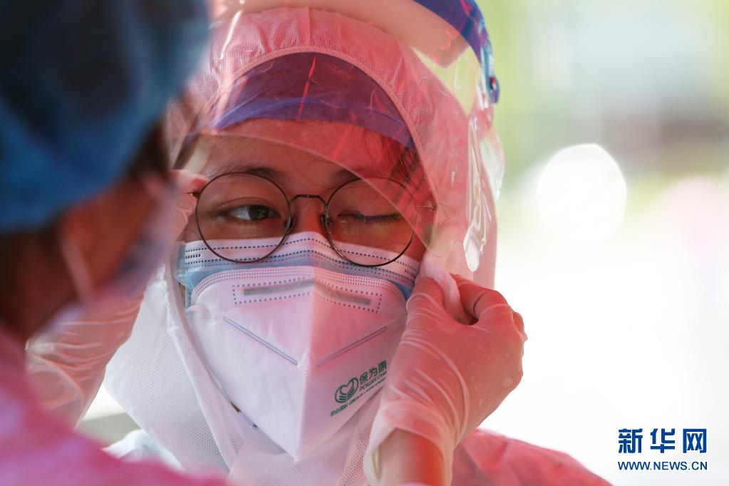在河南省郑州市郑东新区一核酸检测点,医务工作者在同事的帮助下擦拭脸上的汗水(8月2日摄)。新华社记者 许雅楠 摄