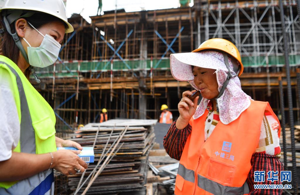 8月4日,在西安市第三医院扩建项目施工现场,中建三局西北公司项目管理人员(左)向施工人员发放防暑药品。新华社记者 张博文 摄
