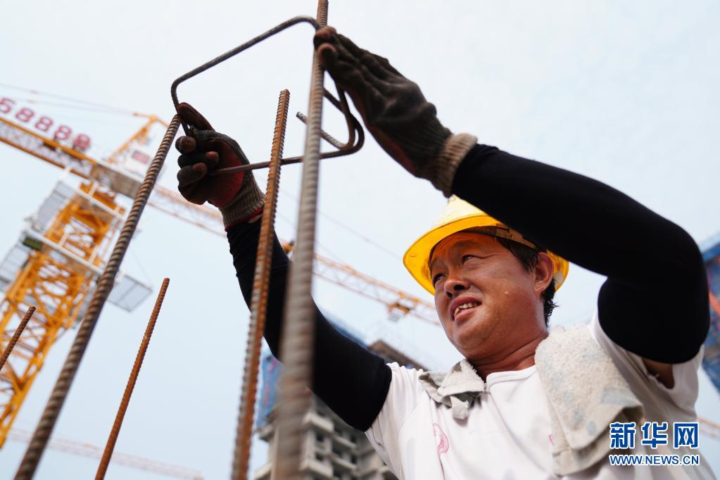 8月4日,建筑工人在河北邢台南宫市山水如意住宅小区建设工地上绑钢筋。新华社记者 牟宇 摄
