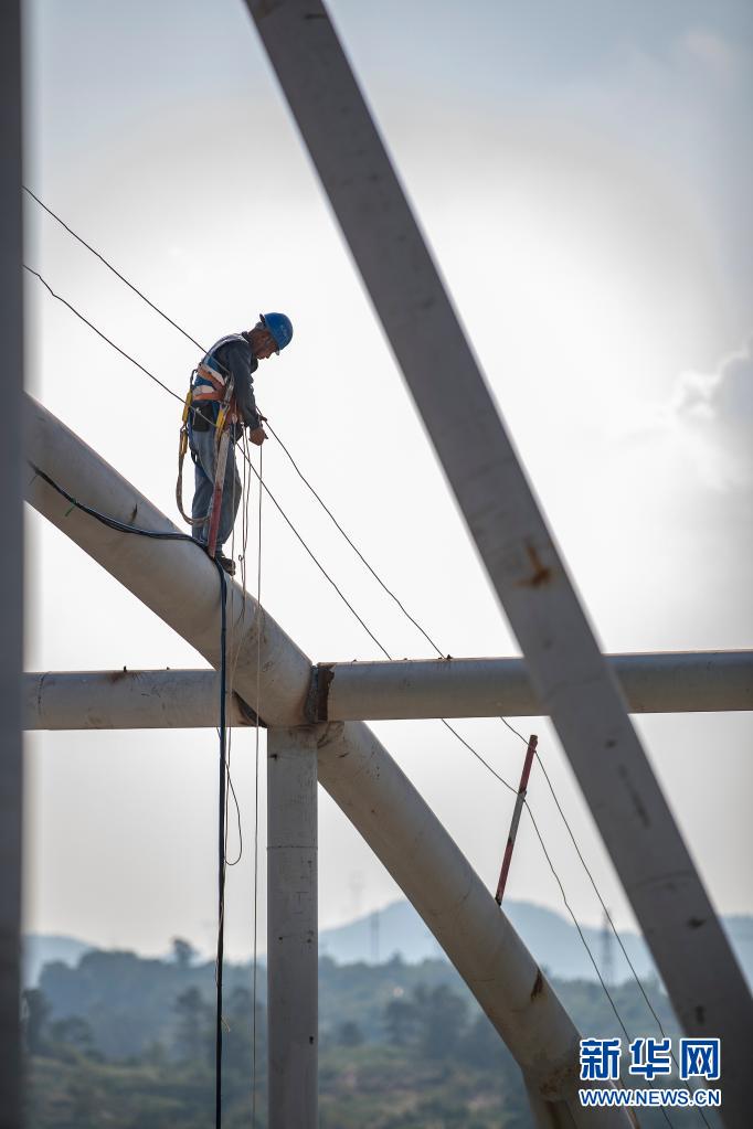 8月4日,中建八局施工人员在重庆龙兴足球场进行屋盖钢结构施工。新华社记者 黄伟 摄