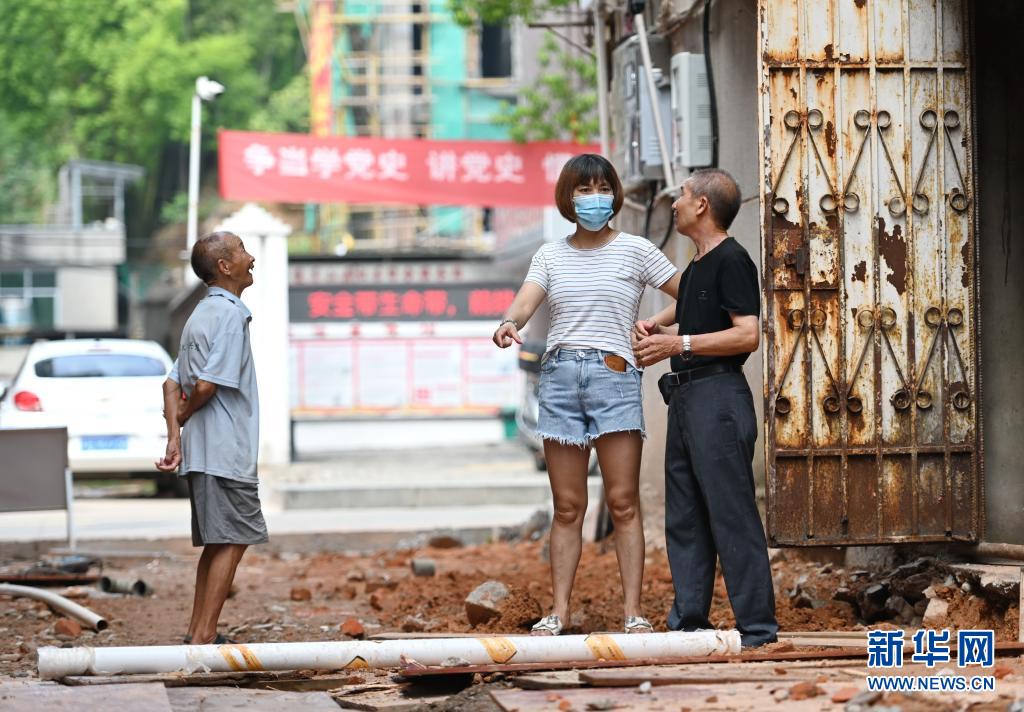 8月4日,邵武市通泰街道月山关社区志愿者李学英(中)在该区居民肖小生家门前协调小巷雨水管网改造问题。