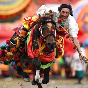 8月4日,当地群众在玉树藏族自治州成立70周年庆祝大会上表演传统赛马。