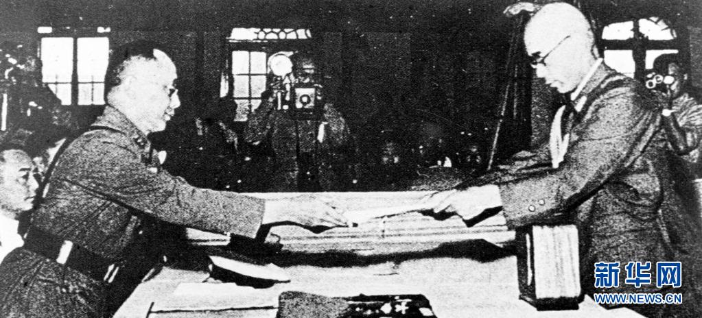 1945年9月9日,何应钦(左)在南京代表中国政府接受侵华日军总参谋长小林浅三郎递交的侵华日军总司令冈村宁次签署的投降书。