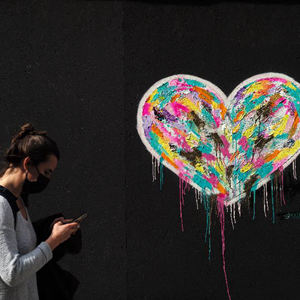 3月24日,行人从美国加利福尼亚州旧金山街头一处心形涂鸦旁走过。