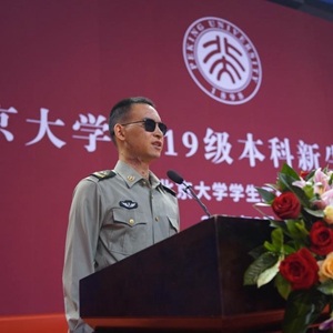 “排雷英雄战士”杜富国在北京大学作先进事迹报告(2019年9月3日摄)。