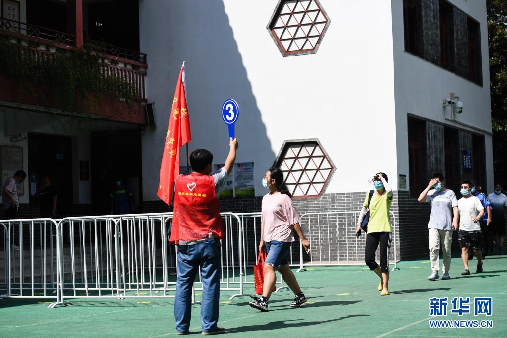 8月5日,在南京市夫子庙小学,志愿者引导市民有序接受核酸检测取样。设立在南京市夫子庙小学内的核酸检测点,为夫子庙景区商户、附近居民等提供核酸检测。